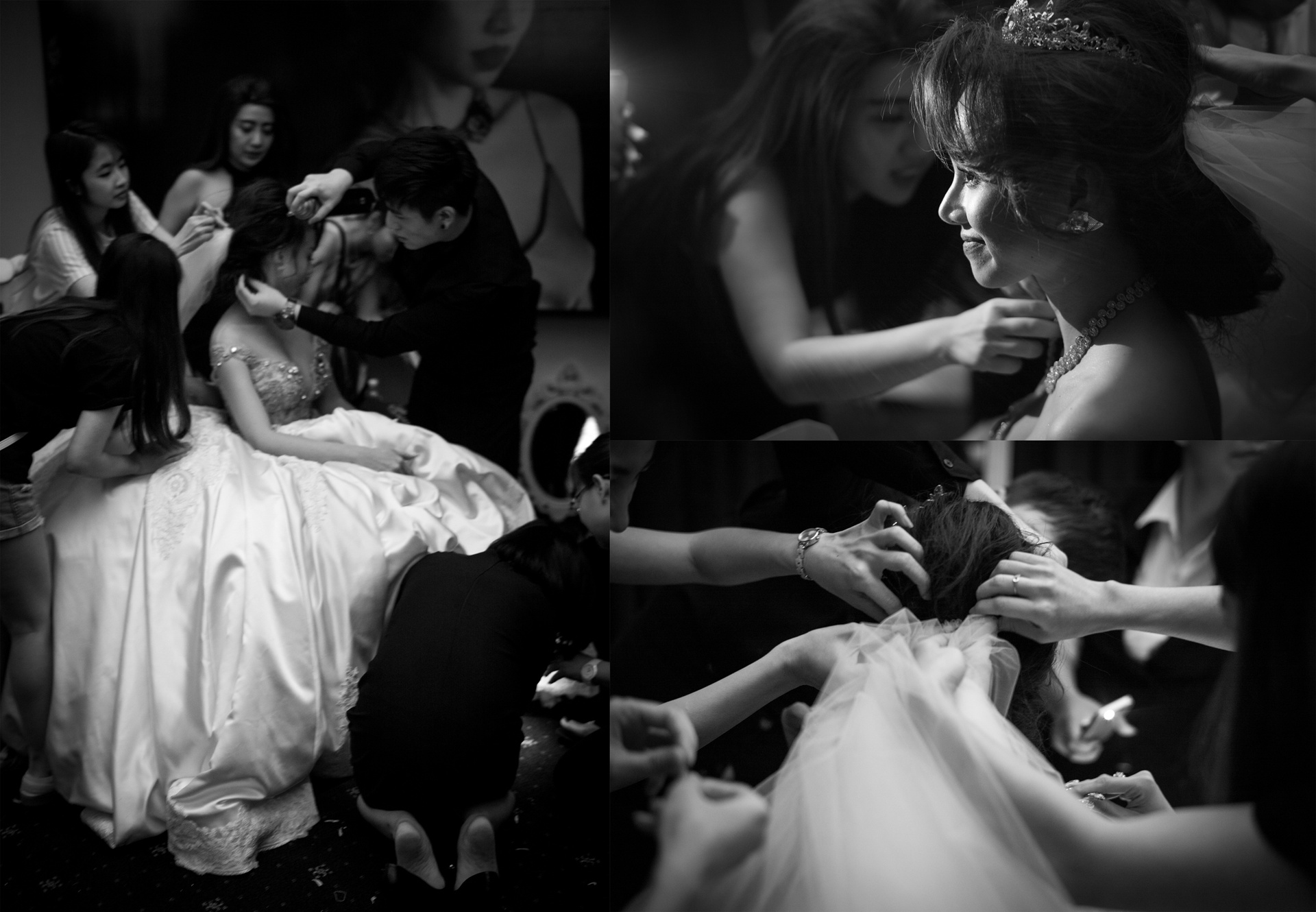 | Ở hậu trường tiệc cưới, cô dâu luôn rạng rỡ niềm vui hạnh phúc dù tất bật thay trang phục, đổi kiểu tóc. |