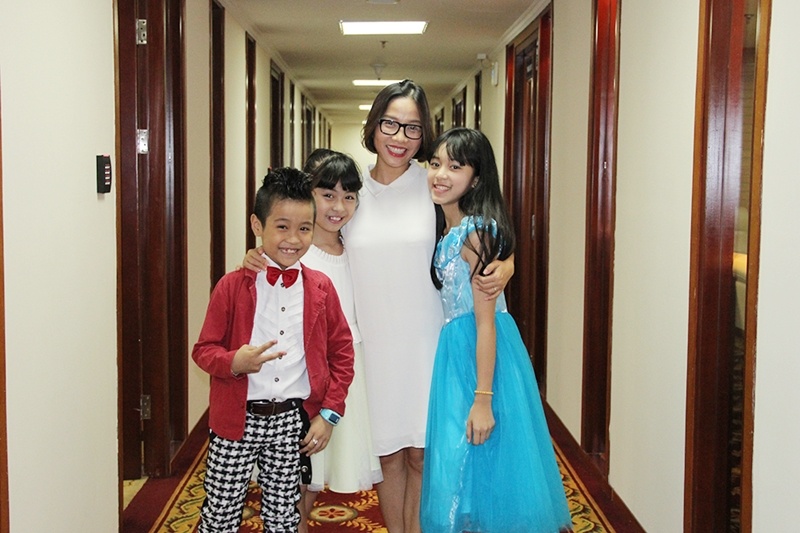 | Diva Mỹ Linh chụp ảnh cùng các thí sinh của cuộc thi Young Hit Young Beat - Nhí tài năng. |