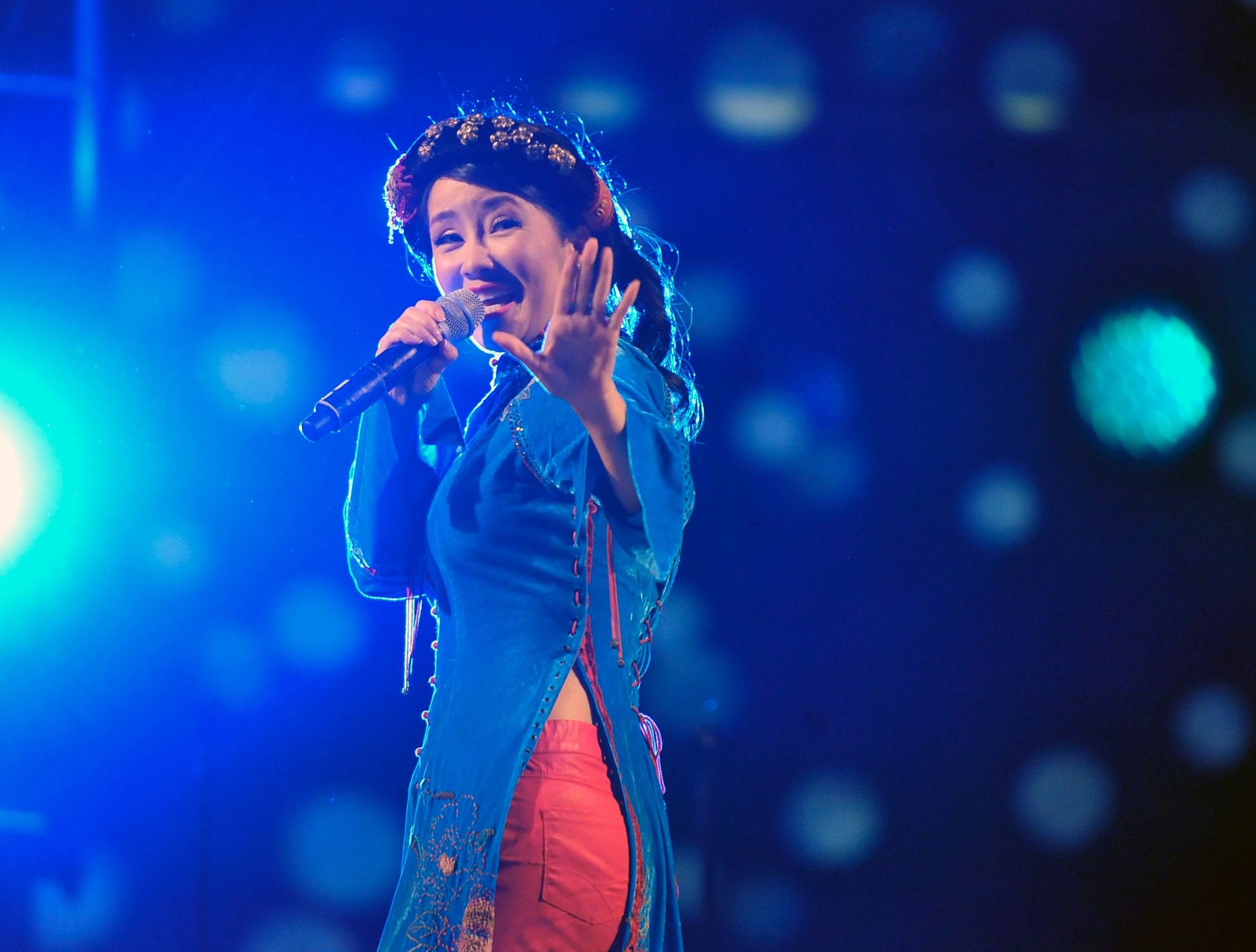 | Hồng Nhung diện trang phục áo dài cách điệu, mang tới không gian âm nhạc nhẹ nhàng, tinh tế với Con chim sâu. |