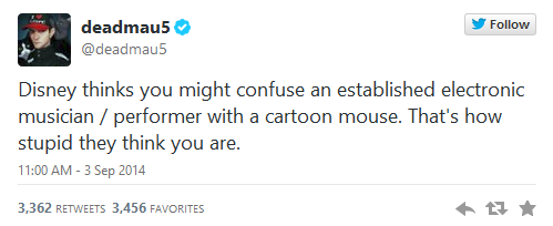Quả thật, biểu tượng mà Joel Zimmerman, tức Deadmau5, đệ trình lên để đăng ký thương hiệu có tương đồng với hình ảnh của chú chuột Mickey, nhưng vụ việc không kết thúc ở đó khi Zimmerman phát biểu trên Twitter cá nhân rằng: “Disney nghĩ bạn sẽ nhầm lẫn giữa một nhạc sĩ kiêm nghệ sĩ trình diễn nhạc điện tử có tên tuổi và một chú chuột hoạt hình. Họ nghĩ các bạn ngốc đến vậy đấy”.