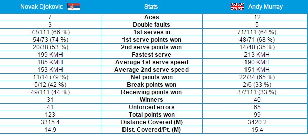 Điểm khác biệt giúp Djokovic chiến thắng có lẽ nằm ở khía cạnh bản lĩnh và sự ổn định hơn trong những pha đôi công. Bất chấp ghi ít điểm winner hơn so với Murray (31 so với 40), số lần đánh hỏng của hạt giống số 1 ít hơn khá nhiều so với đối thủ (41 so với 65).