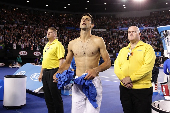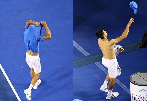 | Phấn khích sau khi giành chiến thắng, Djoker không ngại ngần cởi áo ăn mừng. |