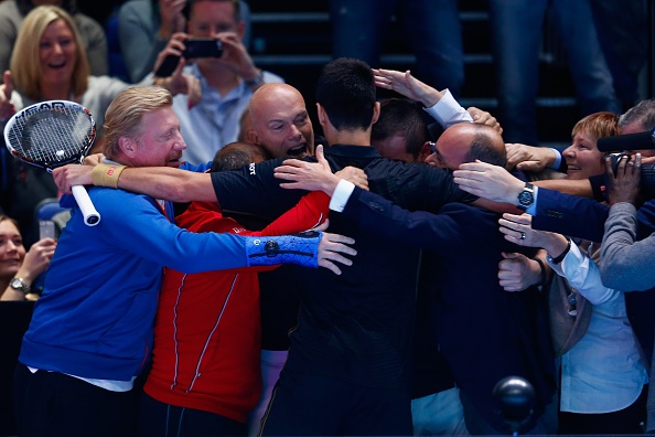 Tay vợt số 1 thế giới ôm chầm lấy ban huấn luyện của mình sau chiến thắng.