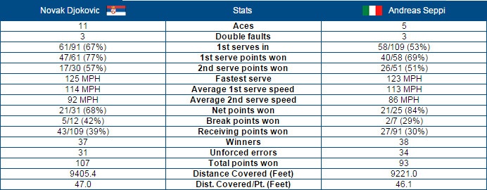 Ở thế cửa dưới song Seppi nhập cuộc rất tự tin. Hạt giống số 25 tạo ra thế trận khá cân bằng nhờ những pha tràn lưới chuẩn xác. Cả trận, Seppi chỉ thực sự thua sút Djokovic ở điểm ace và khả năng tận dụng những cơ hội quyết định. Trong khi những chỉ số quan trọng khác như điểm winner, đánh lỗi, tỷ lệ giao bóng ăn điểm của cả hai tay vợt khá tương đồng.
