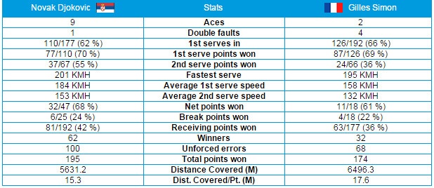 Nhưng thực tế trên sân lại không hoàn toàn diễn ra theo kịch bản ấy. Lối chơi bóng bền ấn tượng và tinh thần quật khởi của Simon đã tạo nên một trận đấu đáng xem hơn rất nhiều. Phải mất tới hơn 4 tiếng rưỡi đồng hồ và trải qua 5 set căng thẳng, Djokovic mới có thể mở toang cánh cửa vào tứ kết.