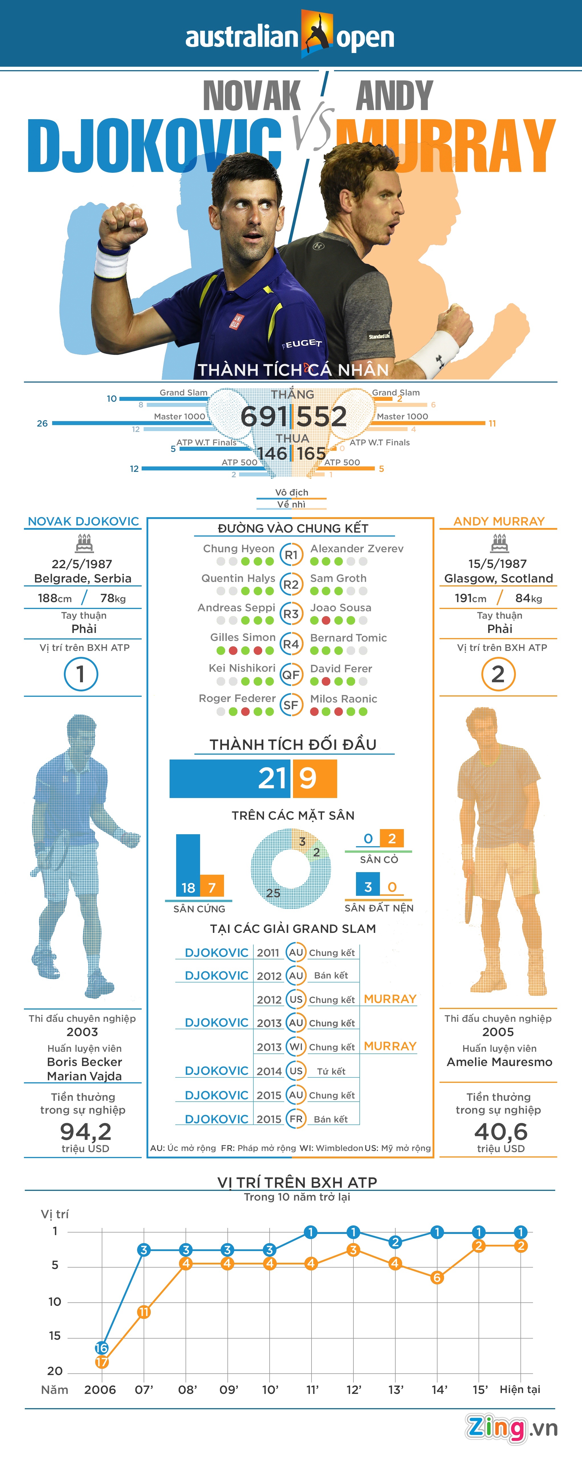 Novak Djokovic hiện là tay vợt số một thế giới, trong khi Andy Murray là số hai. Do vậy, chung kết Australian Open với sự góp mặt của họ lúc 15h30 hôm nay hứa hẹn rất hấp dẫn.