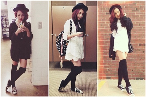 Mũ phớt và tất đen là hai item được yêu thích nhất trong BST trang phục street style của Mie.