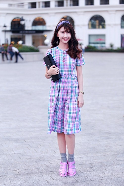 | Quỳnh Anh Shyn cá tính khi diện mốt phối tất với sandals nhựa tím - xu hướng hot trên các sàn diễn xuân hè 2014. |