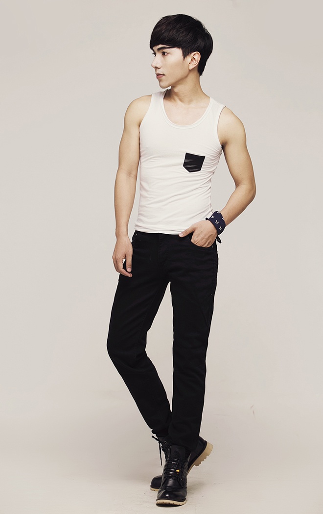 | Áo ba lỗ trắng khỏe khoắn được tạo điểm nhấn với chiếc túi nhỏ giúp chàng trẻ trung hơn. |