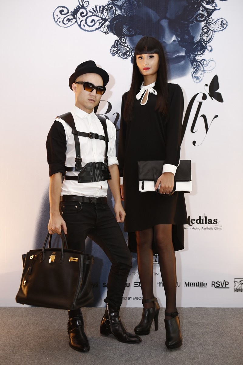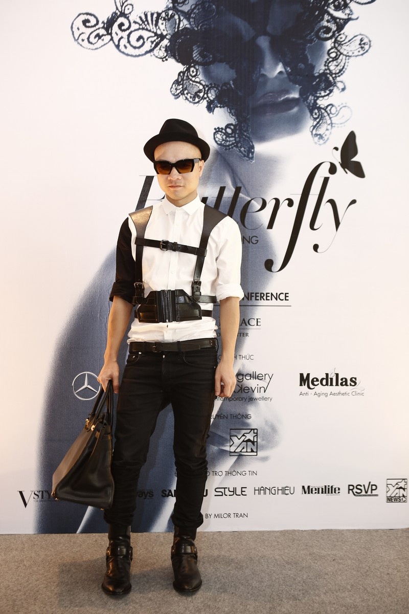 Trong buổi ra mắt báo giới show thời trang ''Những cách bướm cuối thu'', NTK thu hút sự chú ý với ngoại hình được phủ toàn hàng hiệu đắt đỏ.