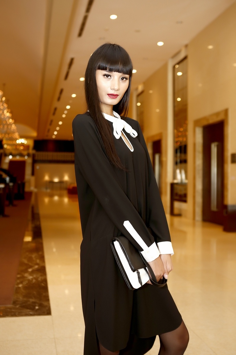 Trang phục được kết hợp ăn ý cùng những phụ kiện giày, tất, túi đề đồng tông đen rất ấn tượng.