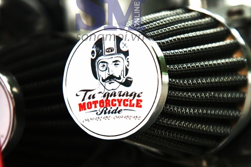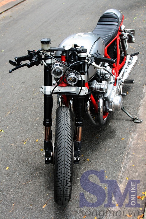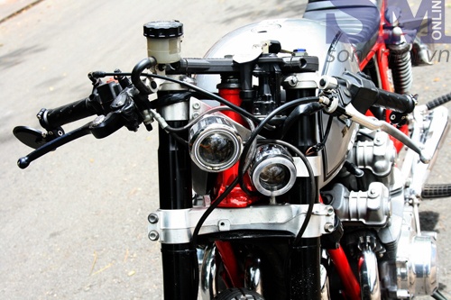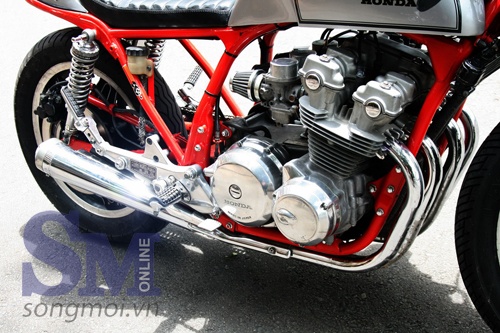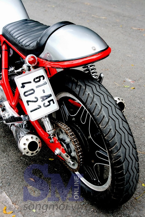 Luôn giữ phương châm sáng tạo nhưng không quá đà, các thay đổi khác được anh Tự thực hiện có chừng mực, như đối với bình xăng hình úp thìa, thợ tự tay cần mẫn gò vát uốn lượn uyển chuyển mà trông vẫn đơn giản ở phần tiếp nối với yên xe, không làm chệch choạng nét thẩm mỹ Cafe Racer. Cặp ống pô chạy dọc ở phần dưới thân xe thì gác chéo vừa phải, nghiêng một góc khoảng 30 độ, với nắp chụp được khoan nhiều lỗ hầm hố, tạo đường nét cân đối hòa hợp với tổng thể dáng xe. Các chi tiết nắp chụp lốc máy, thanh, nẹp, chụp đầu ốc vít… đều được xi mới bóng loáng, nổi bật trên nền hệ thống ống sắt hình thành nên khung sườn xe sơn màu đỏ tươi tắn.