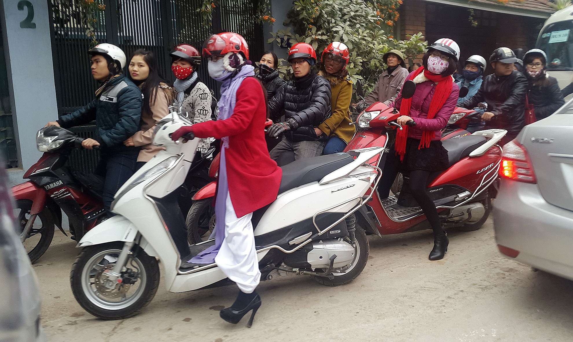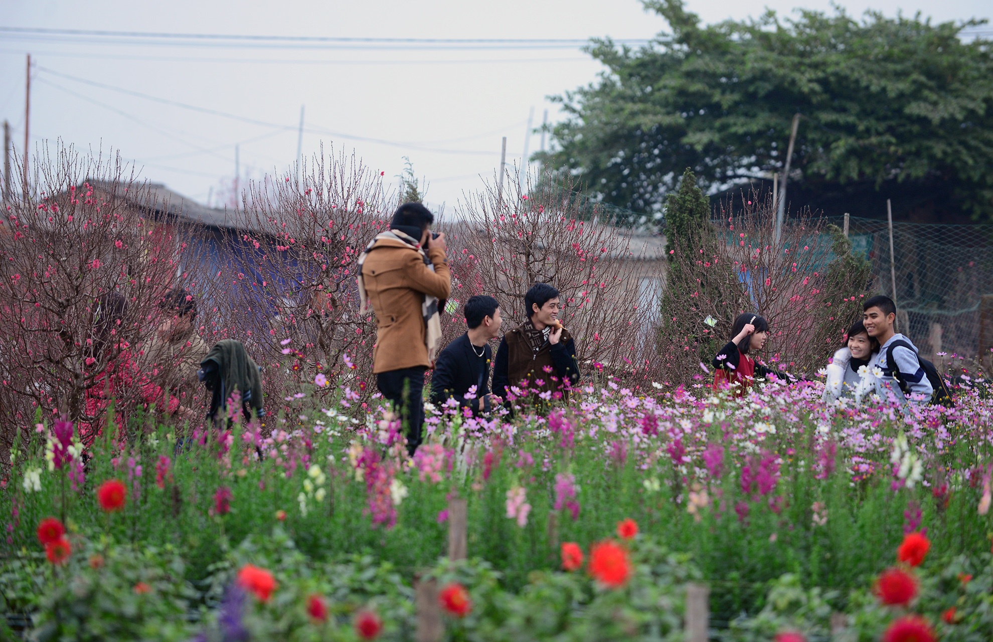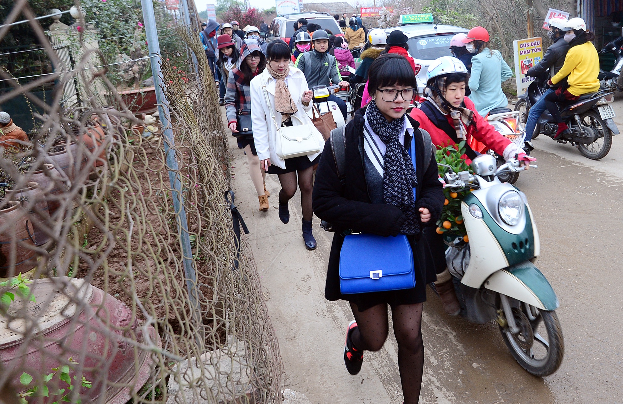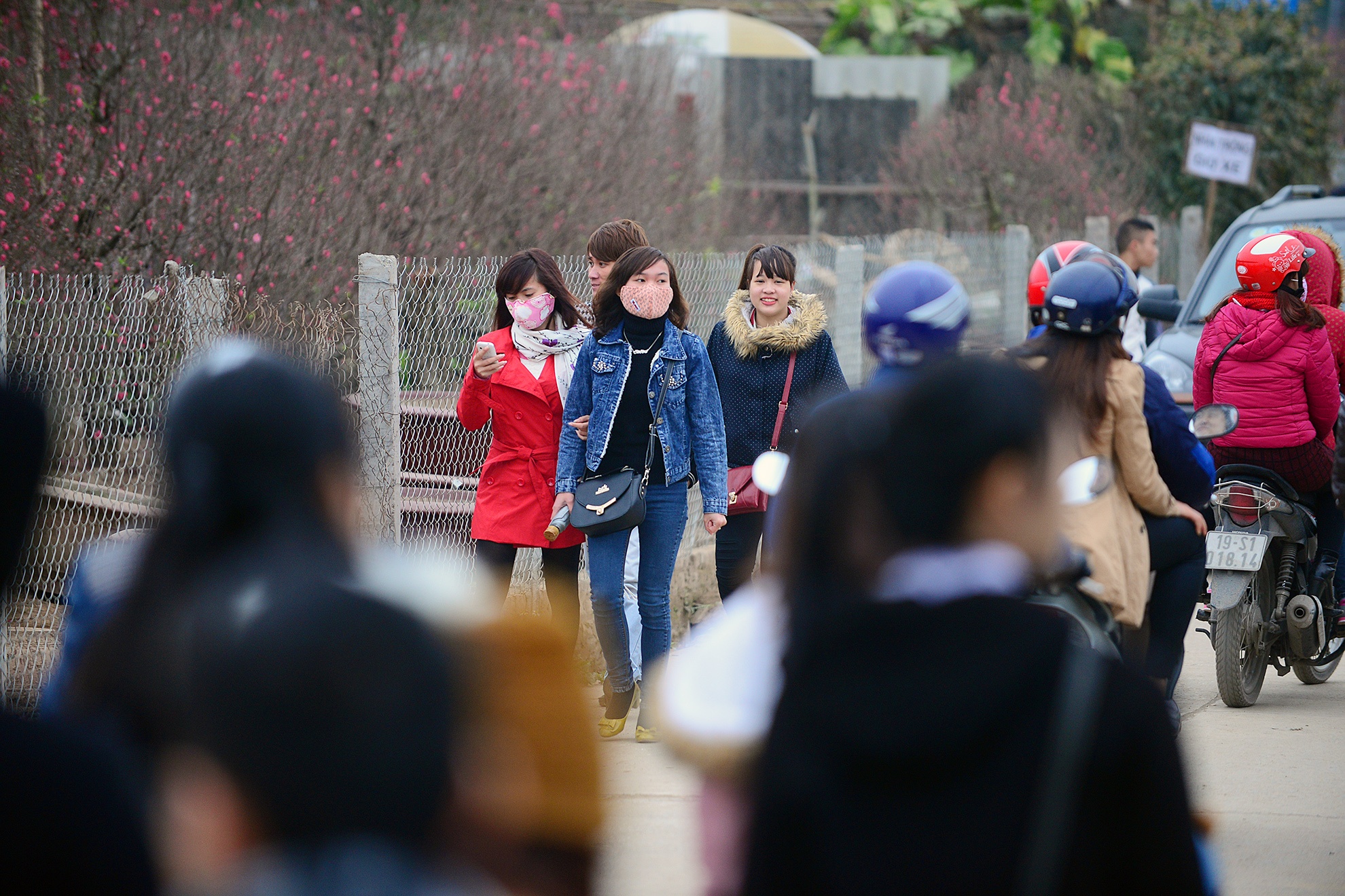 | Hai ngày nay Hà Nội lạnh buốt 13 độ C không ngăn cản được sự háo hức đón không khí xuân của các cô gái. |