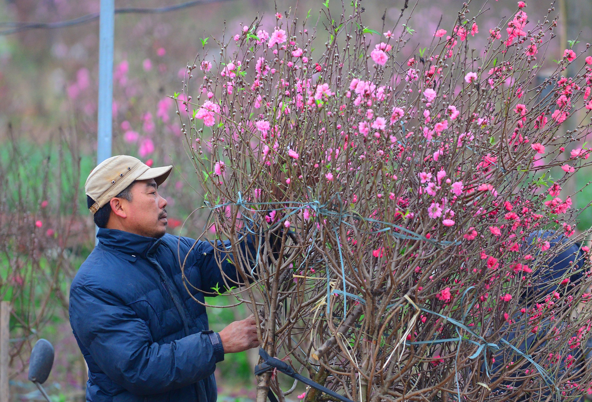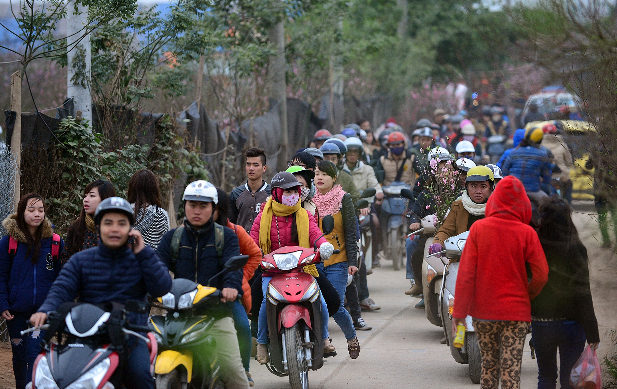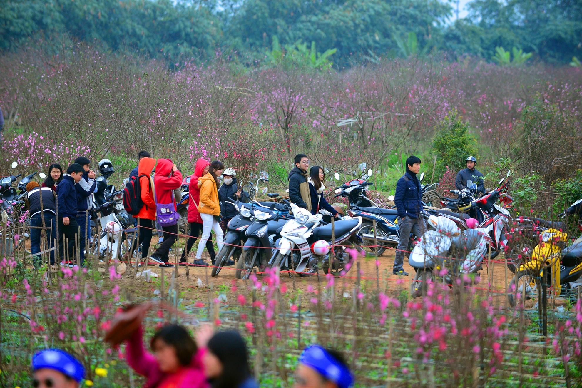| Dịp cuối tuần, nhiều người đến vườn đào Nhật Tân chụp ảnh kỷ niệm và mua đào về cúng rằm tháng chạp khiến các lối vào ùn ứ. |