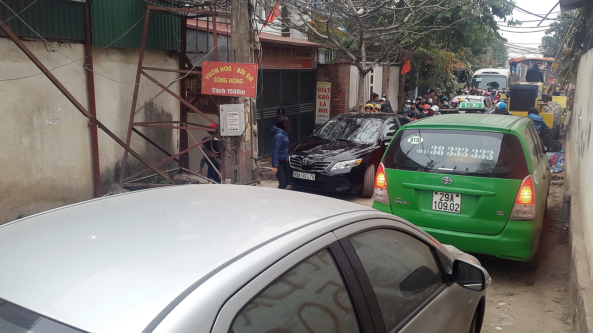 | Ngõ 264 Âu Cơ, nhiều xe taxi và xe con rồng rắn, nối đuôi nhau khiến lối đi không còn chỗ trống. |