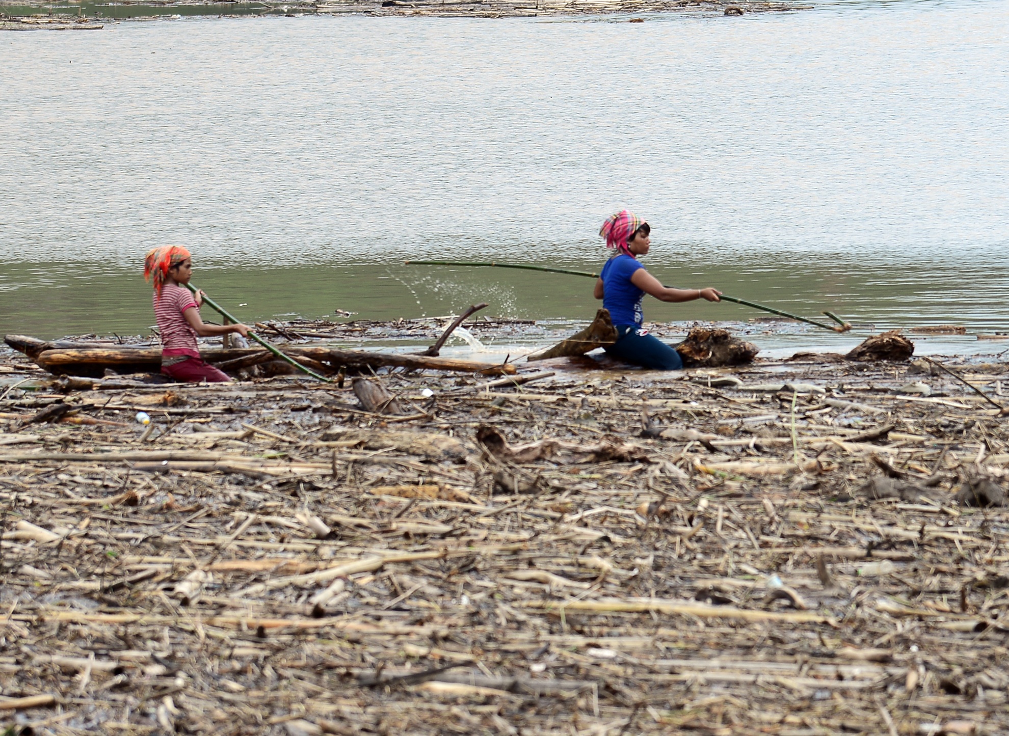 Một số gia đình tập trung cả nhà ra vớt và vận chuyển củi lên bờ.