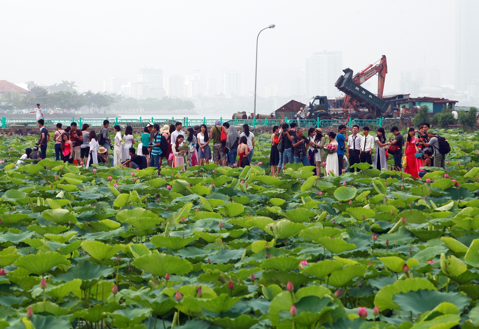 Những ngày này đầm sen lớn nhất Hà Nội bên công viên nước hồ Tây luôn luôn trong cảnh đông đúc, nhộn nhịp giới trẻ đổ về chụp ảnh.