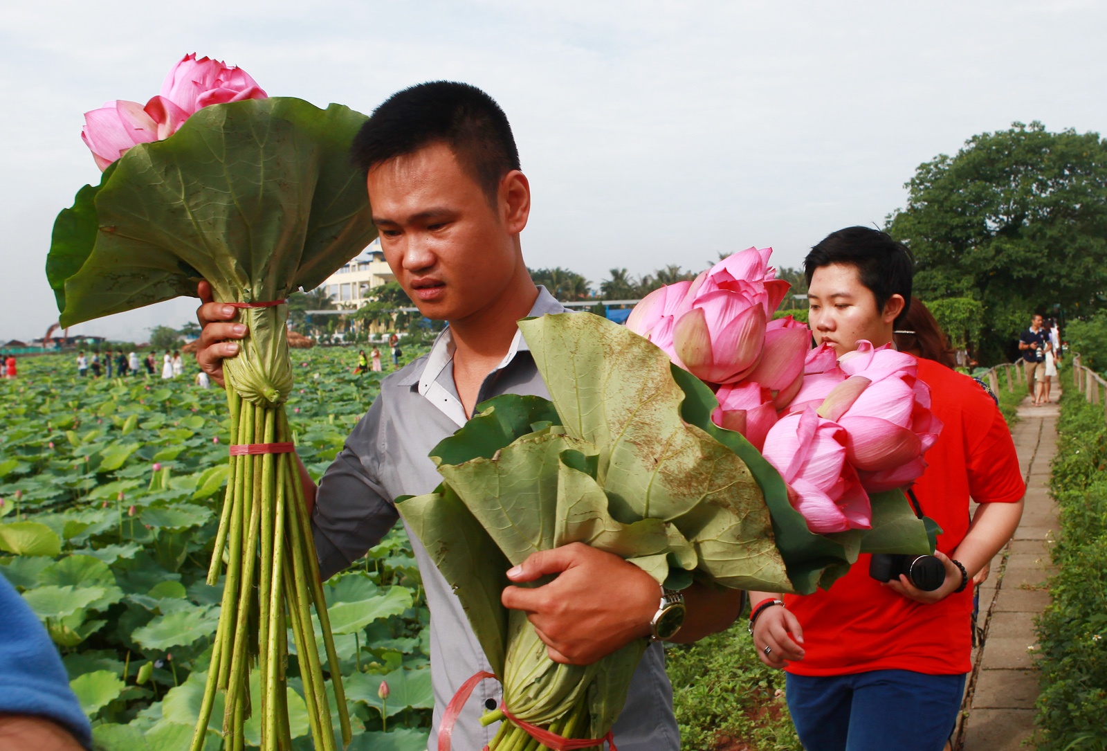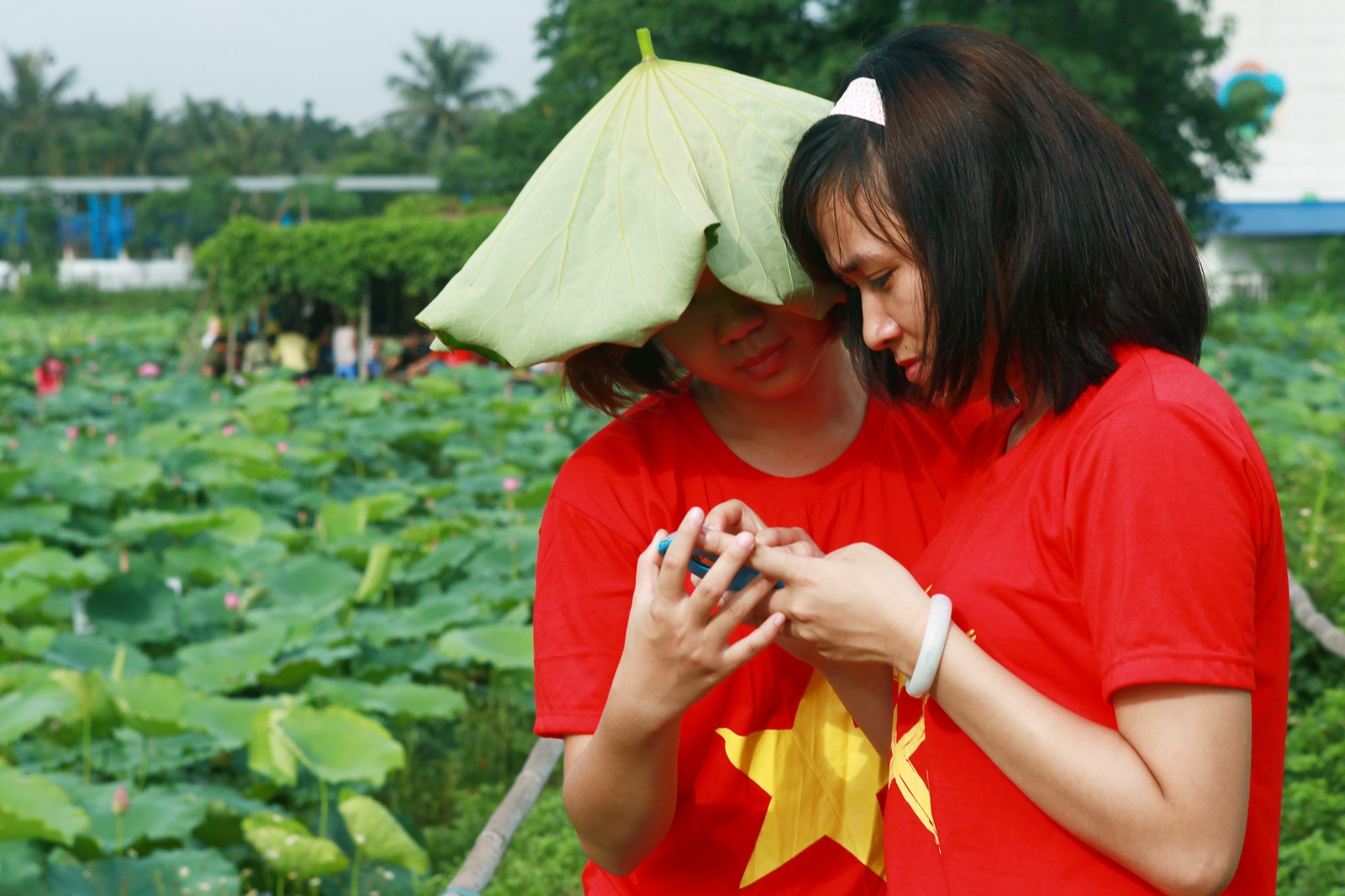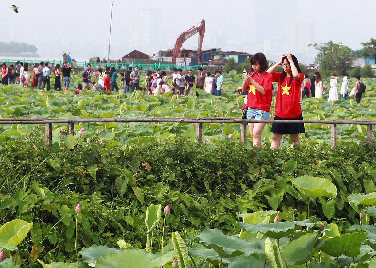 Năm nay, nhiều bạn trẻ còn mặc cả áo hình quốc kỳ đến chụp ảnh cùng sen.