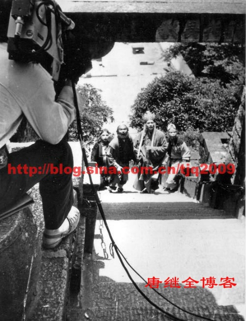 | Quay phim Đường Kế Toàn ôm máy quay (góc trái màn hình) khi quay cảnh thầy trò Đường Tăng bước từng bậc lên Nhục Thân Điện trong cái nóng 40 độ của Cửu Hoa Sơn. Ảnh: Đường Kế Toàn. |