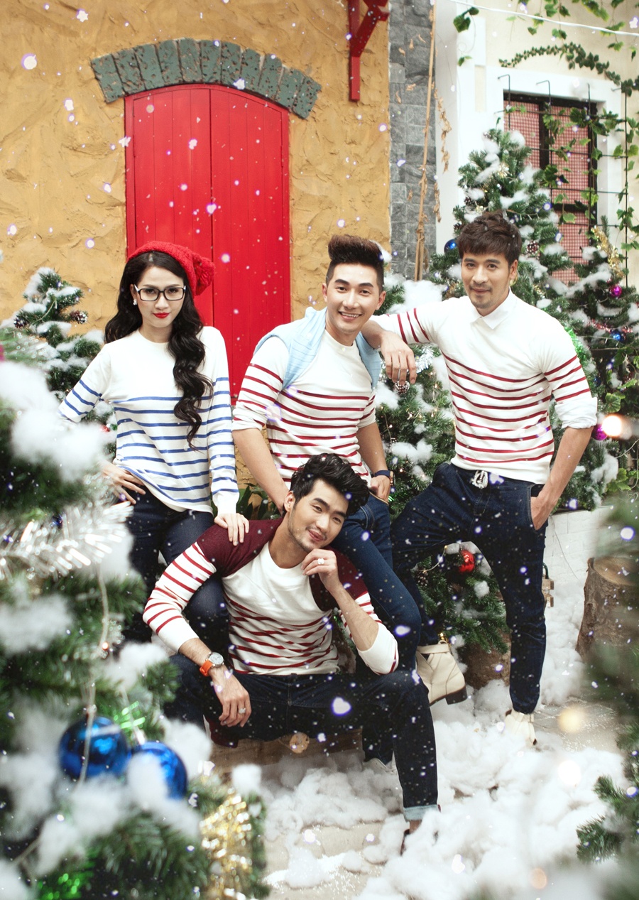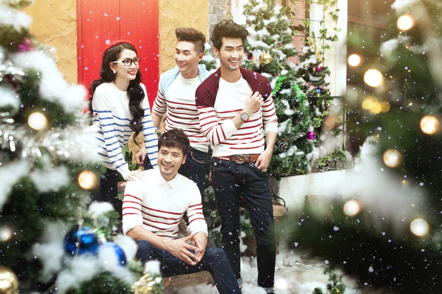 | Với ý tưởng giới thiệu trang phục dành cho mùa Giáng sinh, Đoàn Thanh Tài, Phan Thị Mơ cùng người mẫn Nam Phong, Đàm Thanh thực hiện bộ ảnh mới. Trong ảnh, bốn chân dài làng mốt Việt cùng diện áo thun kẻ sọc, kết hợp quần jeans, giày bata năng động. |