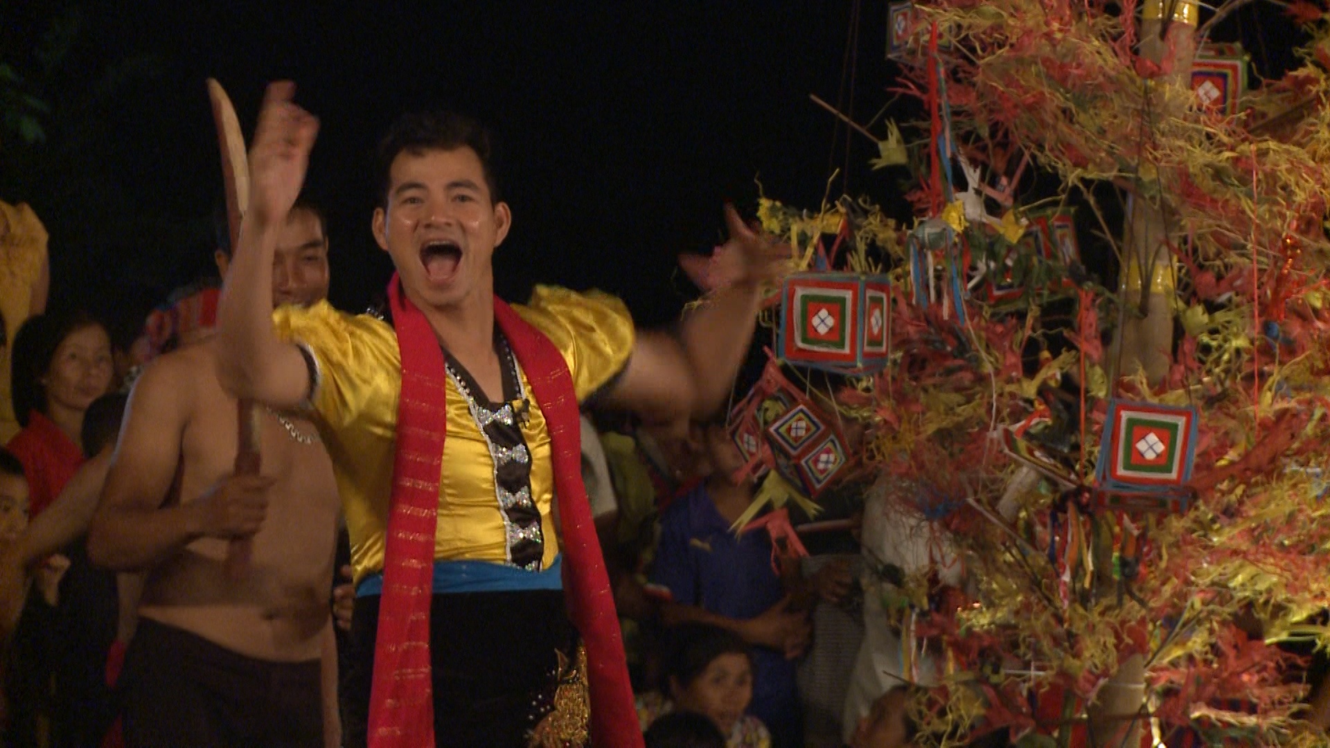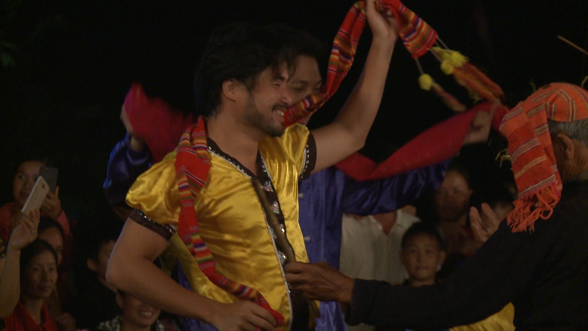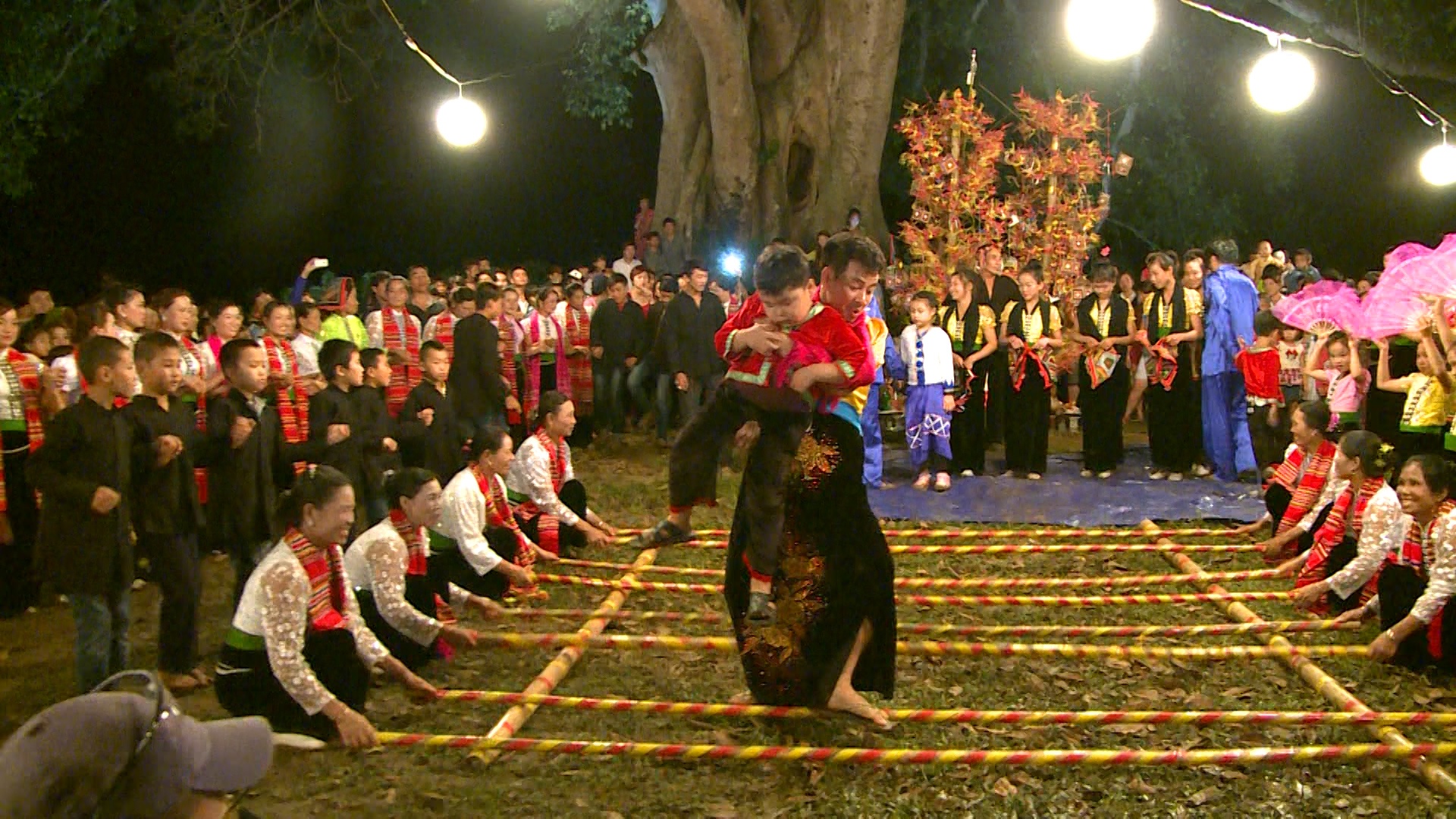 Sau bữa cơm tối, các cặp bố con cùng nhau tham gia lễ hội Hát Tra sôi động và rực rỡ sắc màu. Buổi biểu diễn với sự góp mặt của những vị khách lạ thu hút rất đông khán giả là dân làng và khách du lịch.