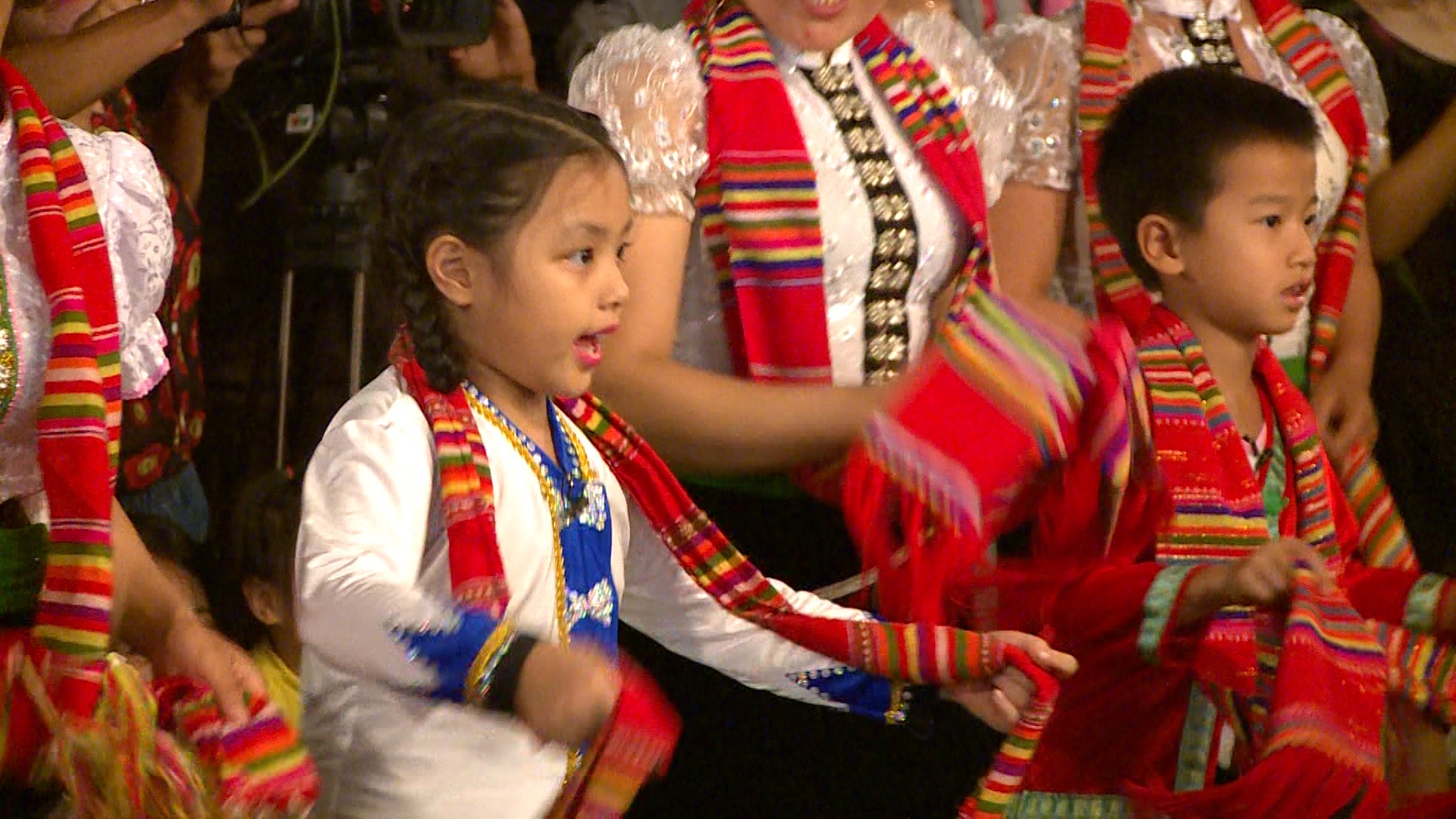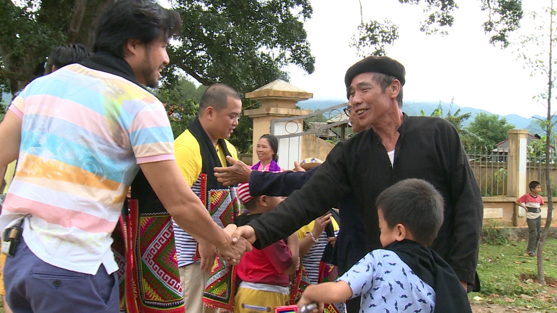 Vượt qua những phút giây ngại ngùng ban đầu, bố của Tốt Ti hào hứng cùng các ông bố khác múa hát trong lễ hội Hát Tra.