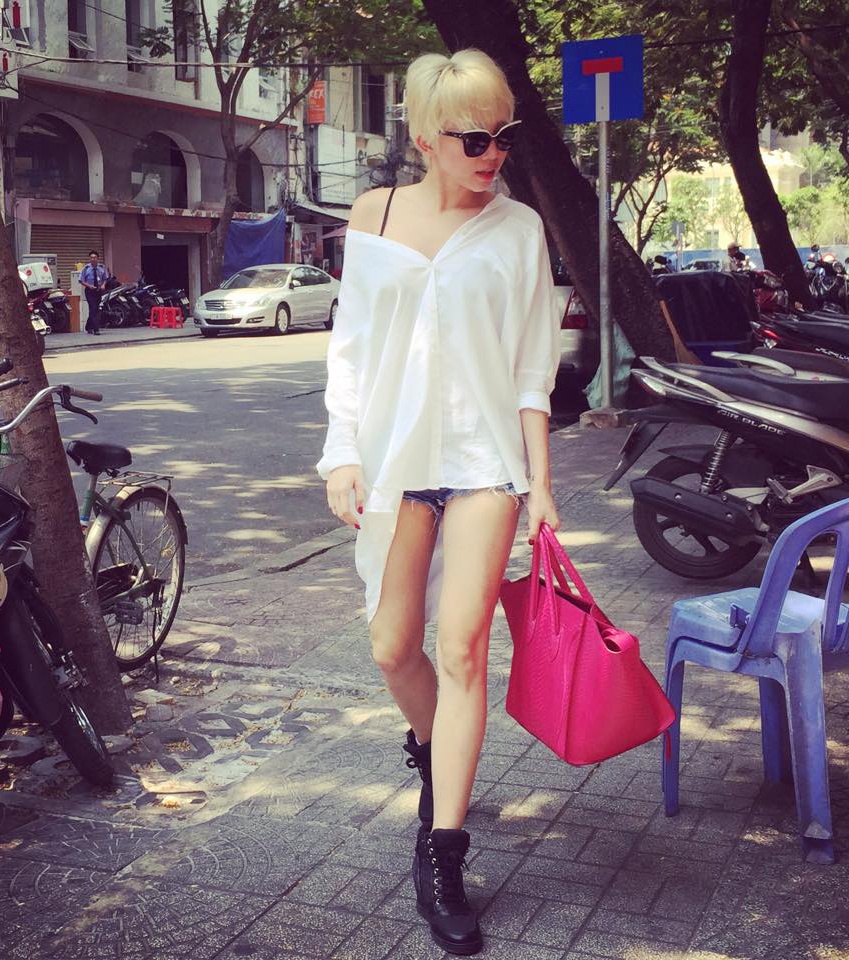 | Trong tủ đồ thời trang của cô nàng cá tính Tóc Tiên không thể thiếu chiếc quần short jeans rách. Phối hợp quần jeans rách với áo sơmi trắng dáng rộng, boot buộc dây giúp Tóc Tiên gây ấn tượng với người đối diện. |