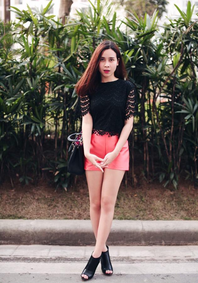Trương Quỳnh Anh xuống phố trẻ trung với quần short đen được tô điểm thêm họa tiết bắt mắt.