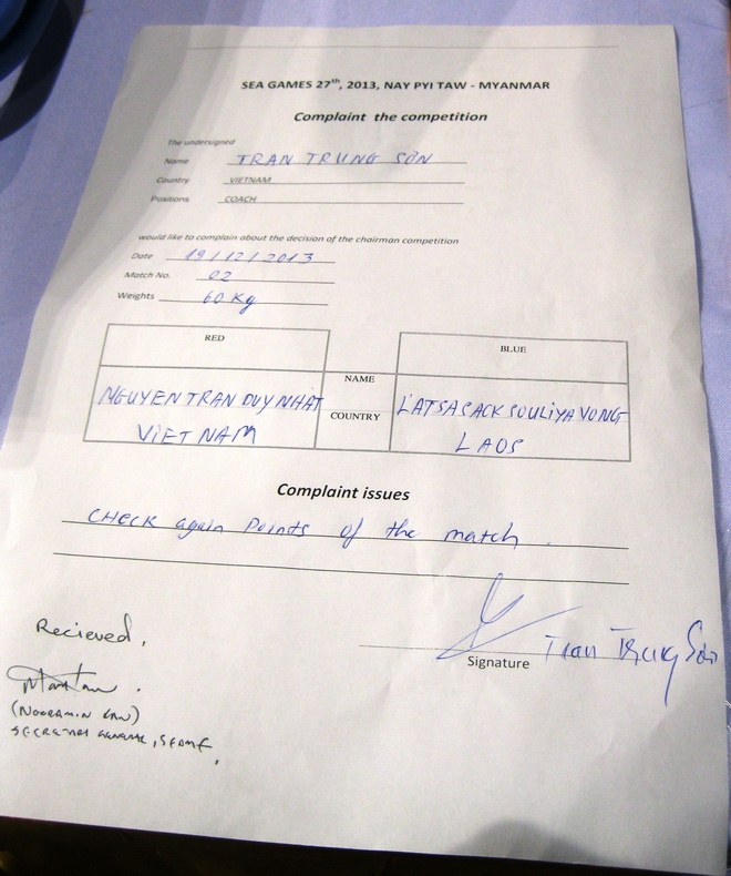 BHL đội tuyển Muay Việt Nam đã làm đơn khiếu nại lên các trọng tài nhưng chỉ nhận được câu trả lời: “Muốn kiện cứ đóng tiền ở đây, nhưng chẳng thay đổi được kết quả đâu”.