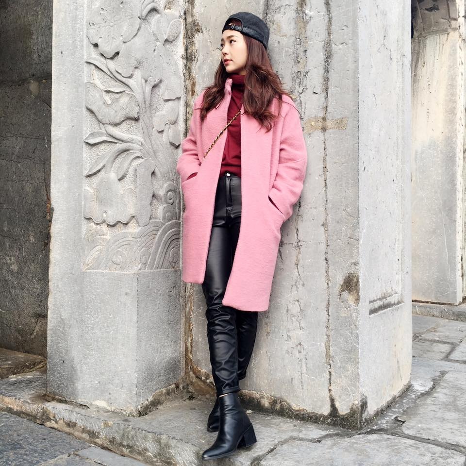 | Thời trang ngày đông ấm áp của Minh Hằng với bốt, quần da và áo khoác hồng tươi tắn.