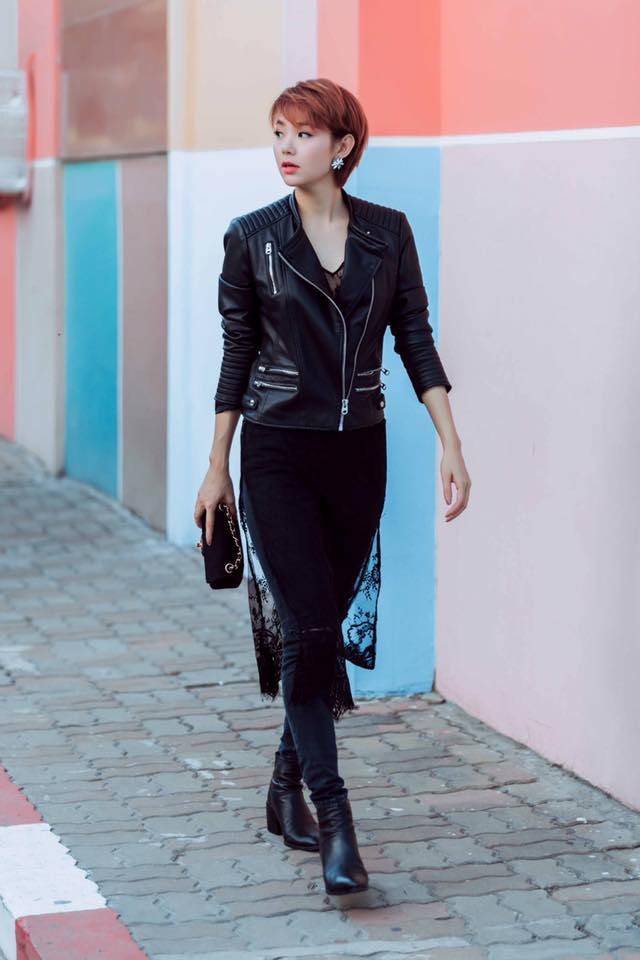 | Đôi ankle boots với phần đế chắc chắn giúp Minh Hằng thuận tiện khi di chuyển đồng thời dễ kết hợp nhiều phong cách. Hình ảnh cô ca sĩ cá tính với bộ đồ đen và đôi bốt yêu thích rất được khen ngợi.
