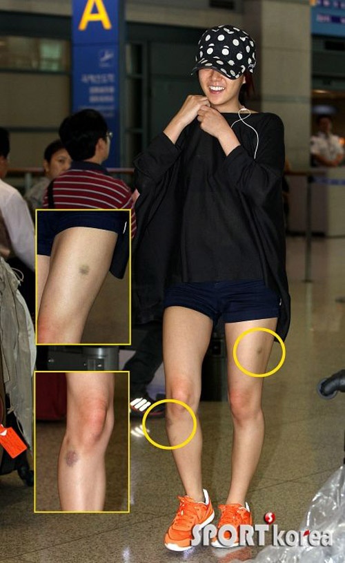 | Han Seung Yeon (Kara) lộ rõ đôi chân đầy vết thâm khiến fan lo lắng. |