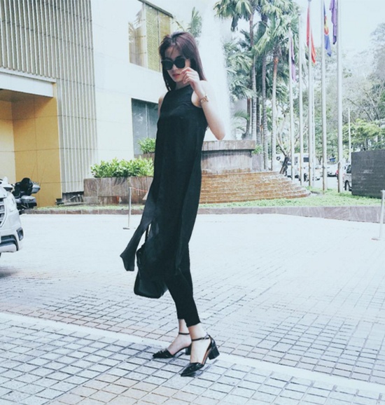 | Cũng với cây đen, Kỳ Duyên chọn cách mix cùng áo xẻ và quần legging trẻ trung. |