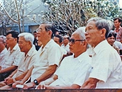 Các vị lãnh đạo cao cấp Phạm Văn Đồng, Nguyễn Văn Linh, Phạm Hùng... dự Hội nghị Phước Long tổ chức tại Công ty Dệt Phước Long, TP.HCM. Ảnh tư liệu. |