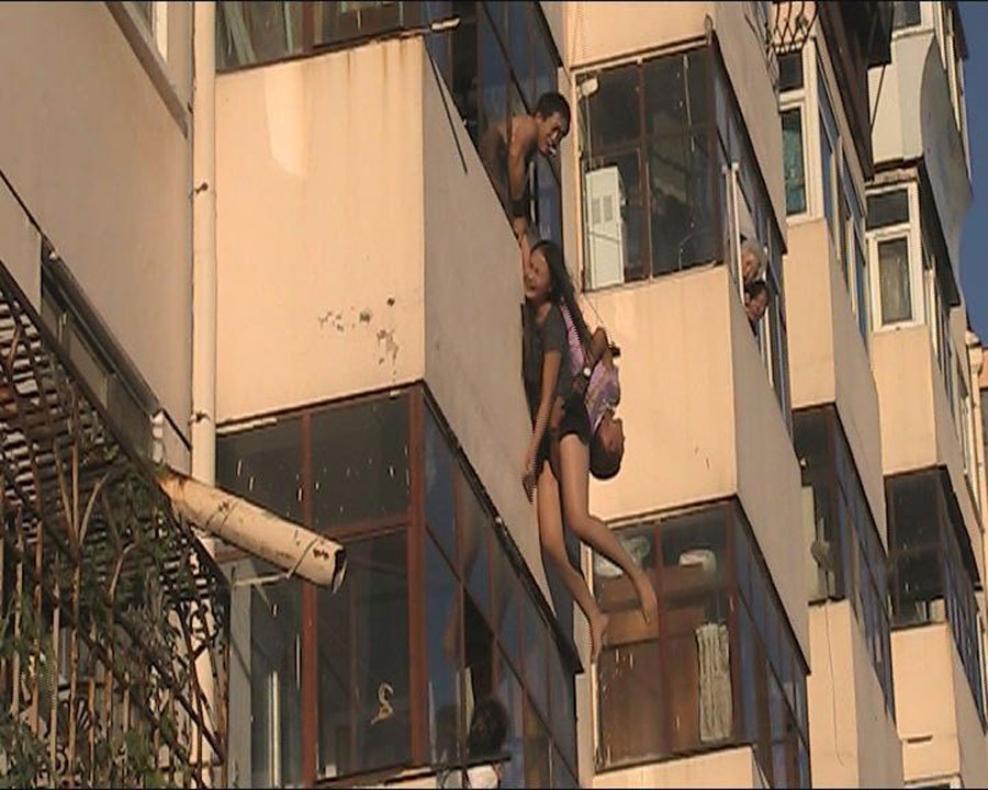 | Đôi nam nữ lơ lửng ngoài ban công tầng 4. |