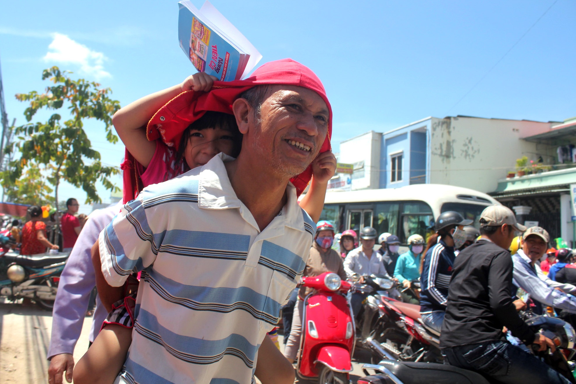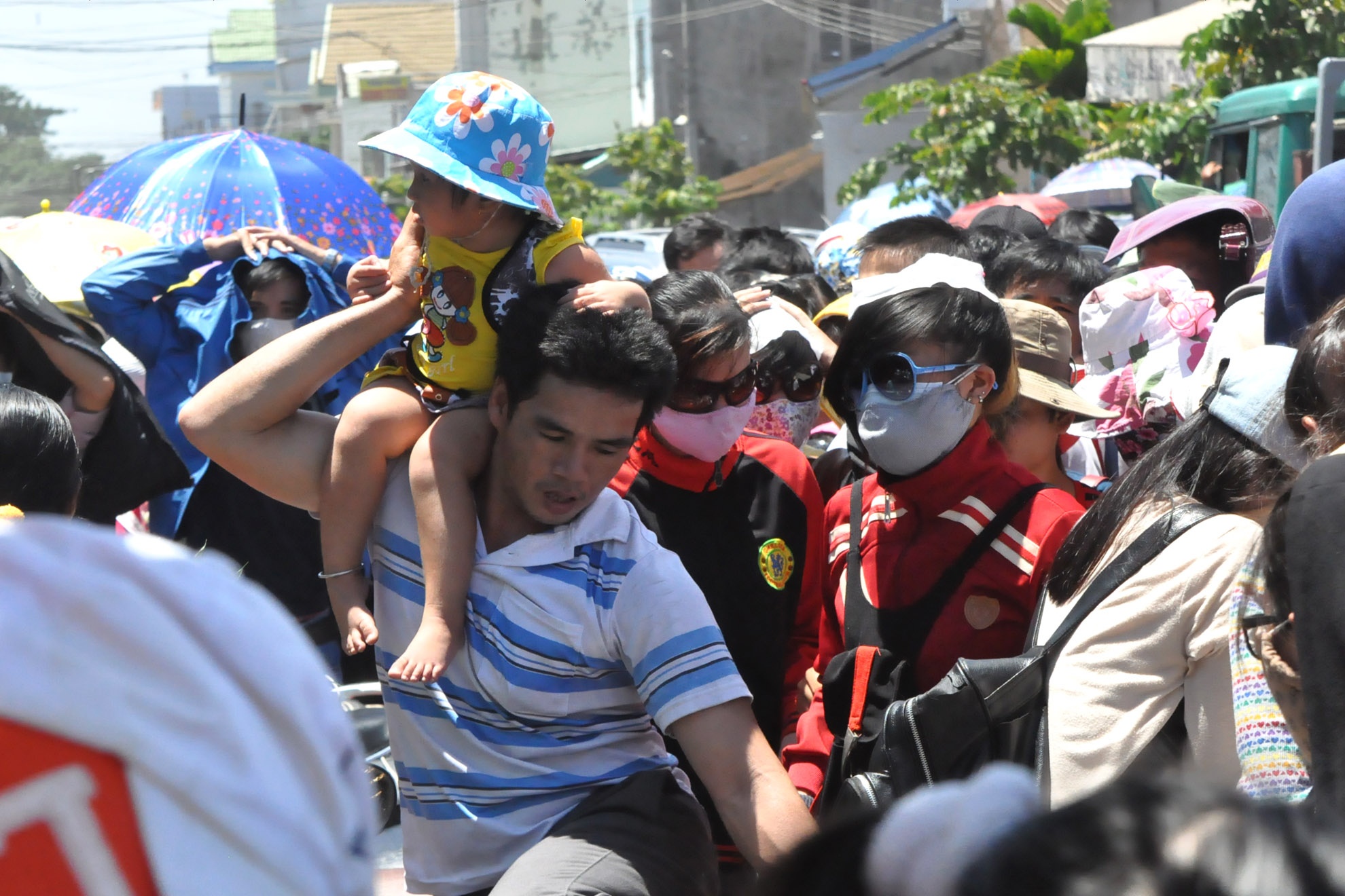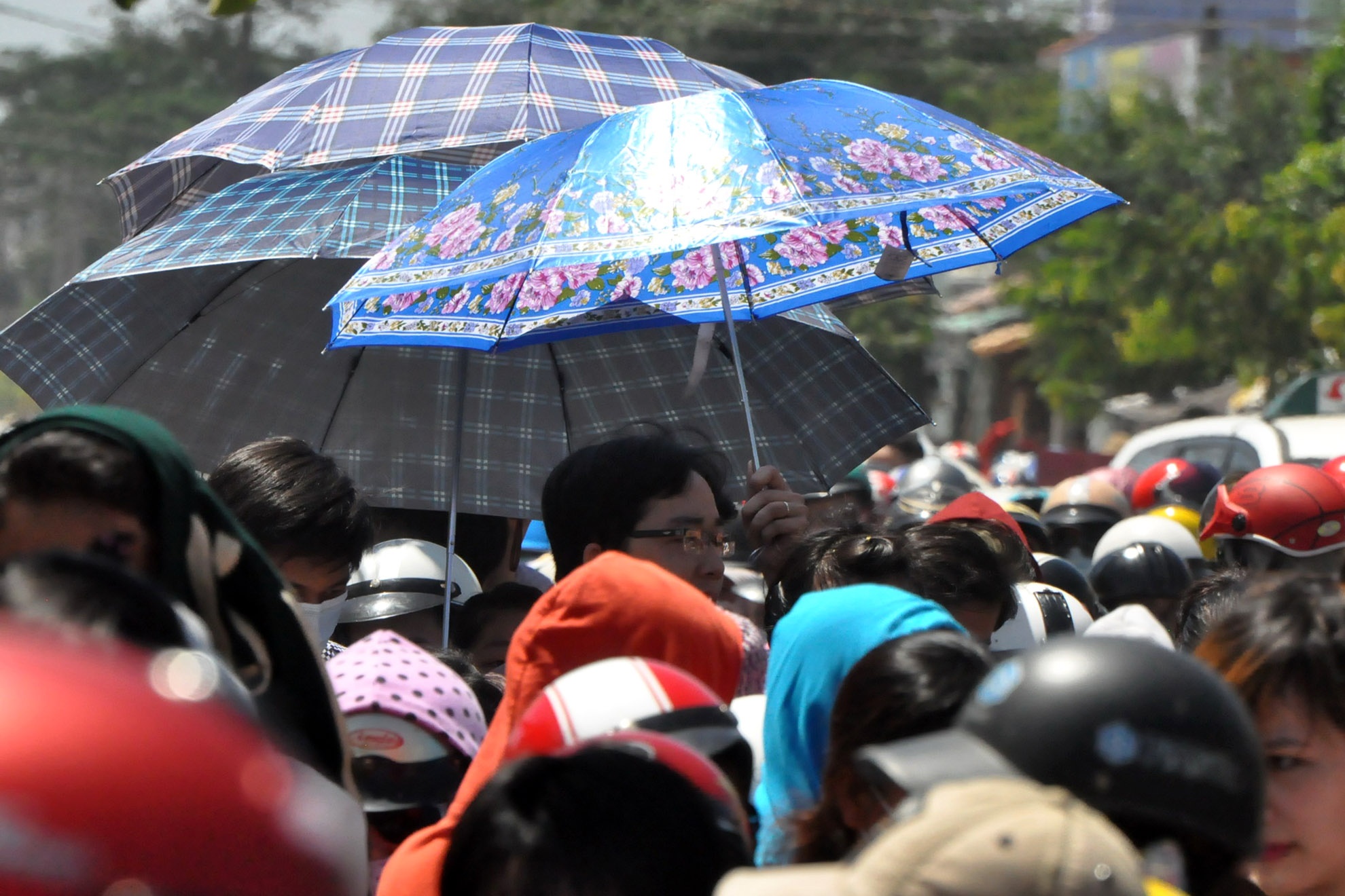 | Trời càng về trưa càng nắng bức nhưng dòng người đổ vể dự lễ báo hiếu không ngừng. Nhiều người tìm đủ mọi cách để che nắng khi chen nhau vào chùa. |