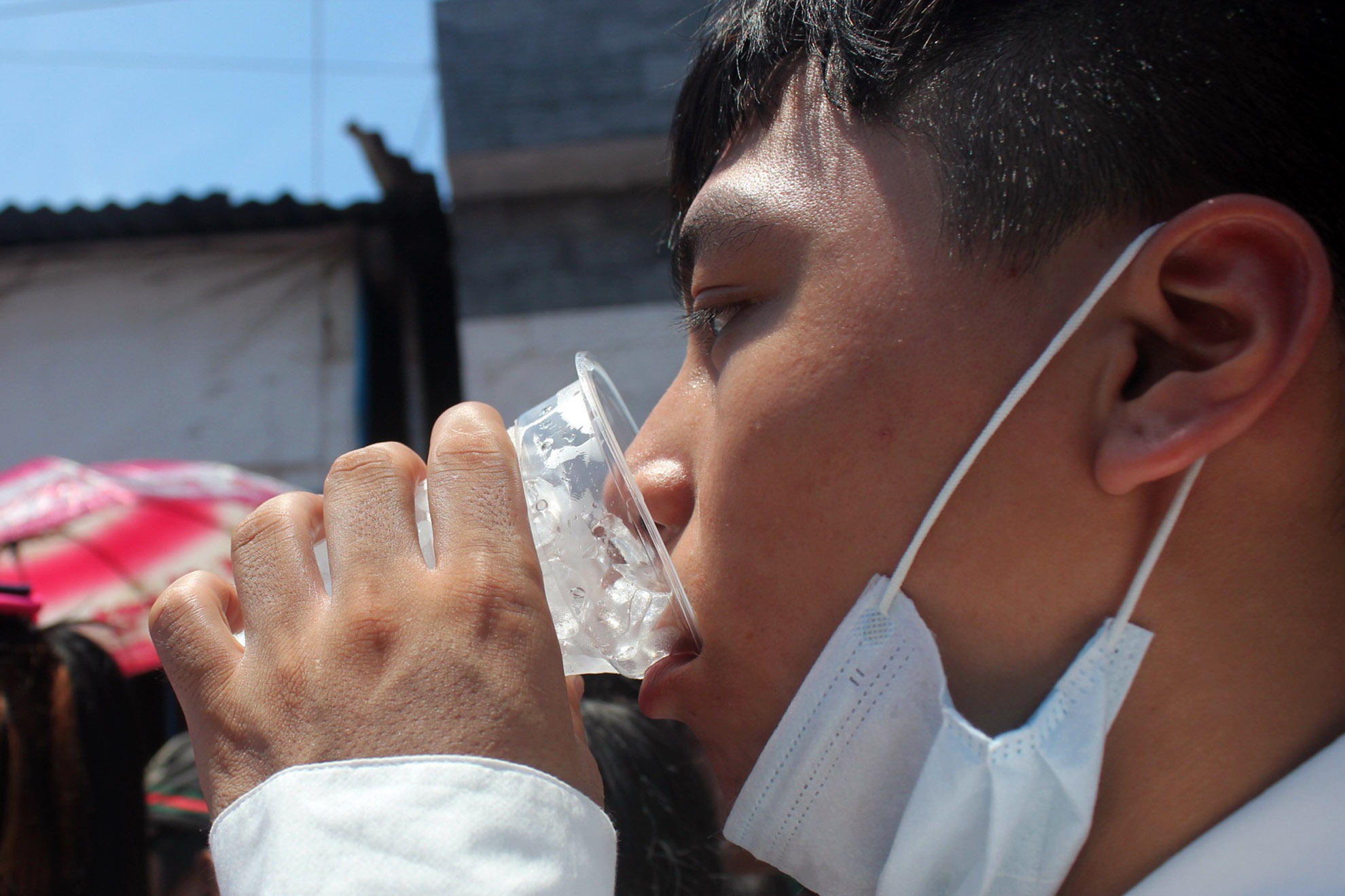 | Đi bộ từ quảng đường gần 1km từ chỗ gửi xe đến cổng chùa Hoằng Pháp, nhiều người mệt lử, tranh thủ vừa tiến vào chùa vừa uống nước để giải nhiệt. |