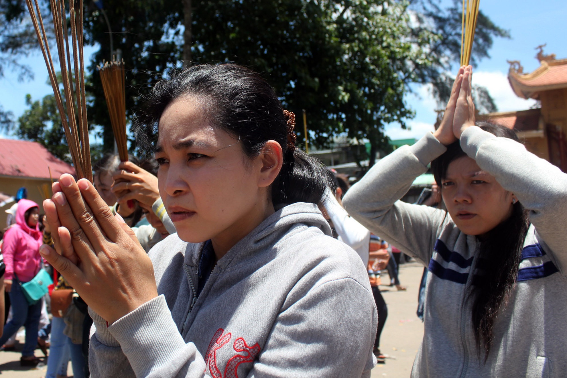 | Trời giữa trưa nắng bức nhưng nhiều người vẫn đội nắng thắp hương trong lễ báo hiếu trước sân chùa. |