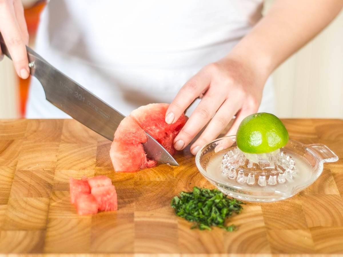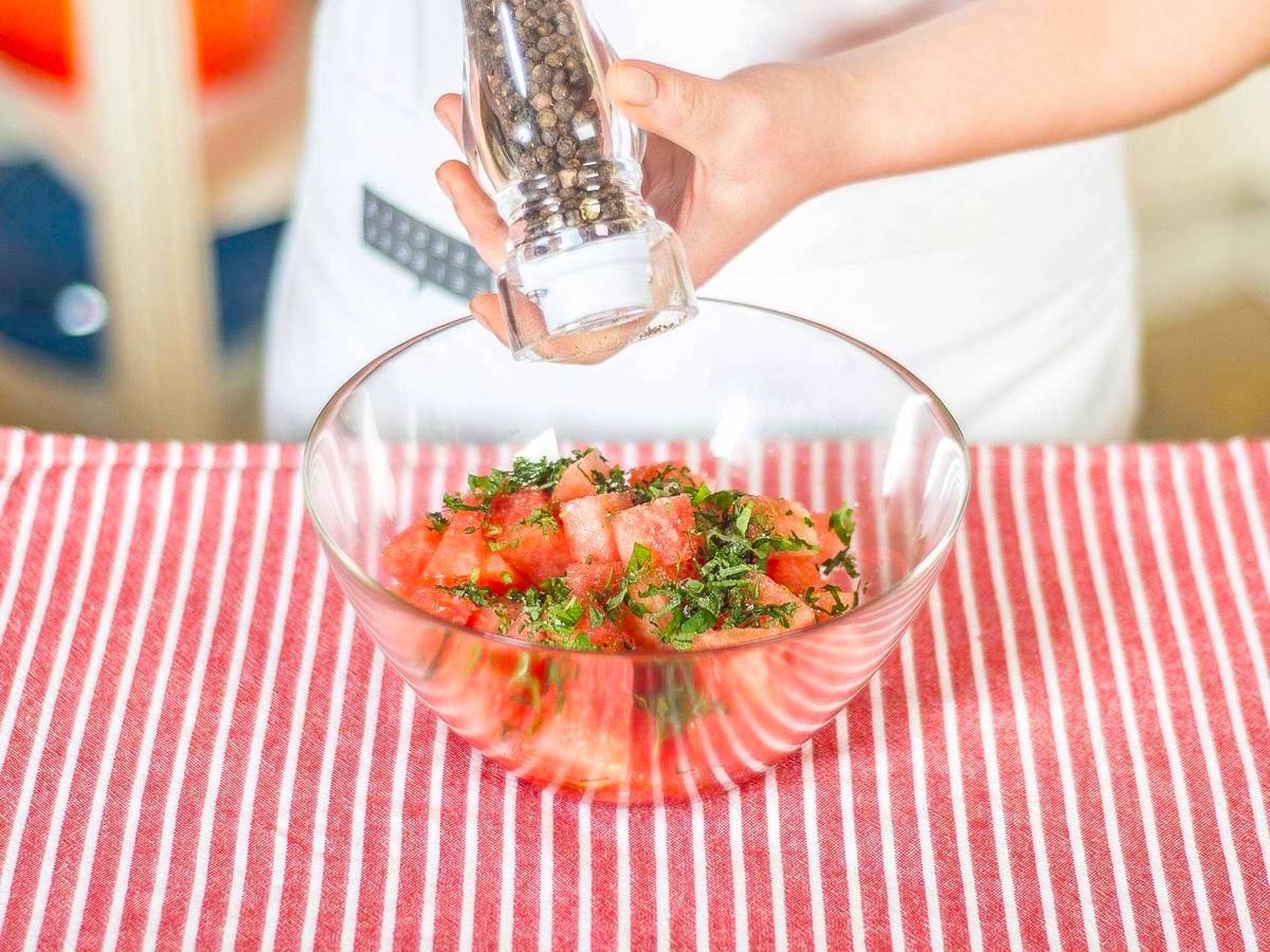 - Đặt dưa hấu và lá bạc hà đã cắt vào một bát lớn, nêm nước cốt chanh, dầu olive, đường, muối và tiêu.