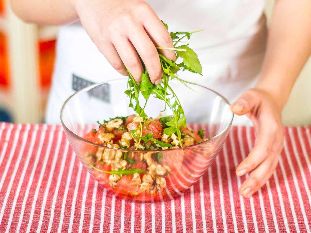 - Rửa sạch và để ráo rau cải lông rồi thêm vào bát dưa hấu.