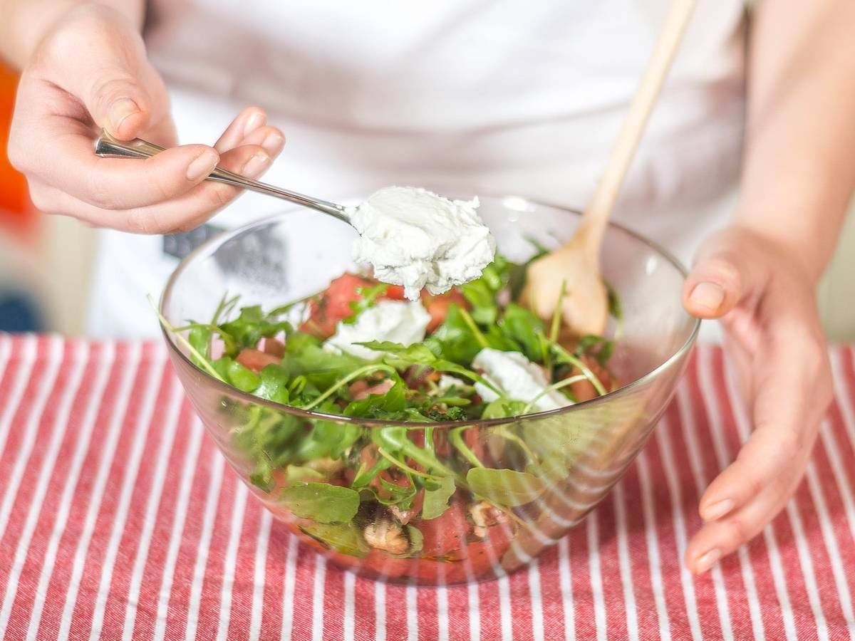 - Trộn đều các thành phần có trong tô và thêm phô mai dê lên trên.