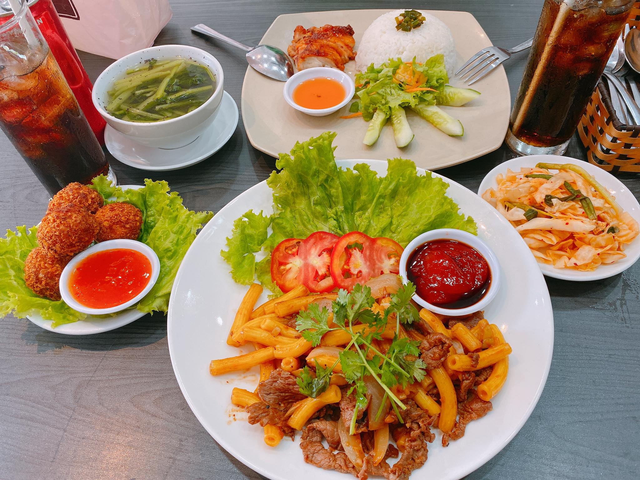 Bạn có thể trải nghiệm các món khai vị như gỏi gà đu đủ Thái, chả giò Philippines. Đặc biệt, thực đơn nổi bật với nhiều kiểu cơm lạ miệng. Cơm gà da giòn, thịt heo sốt Teriyaki, sườn xào, cà ri hay cánh gà sốt cay Hàn Quốc là một số gợi ý hấp dẫn. Ngoài ra, bạn còn có cơ hội thưởng thức miến xào, spaghetti, pad Thái...