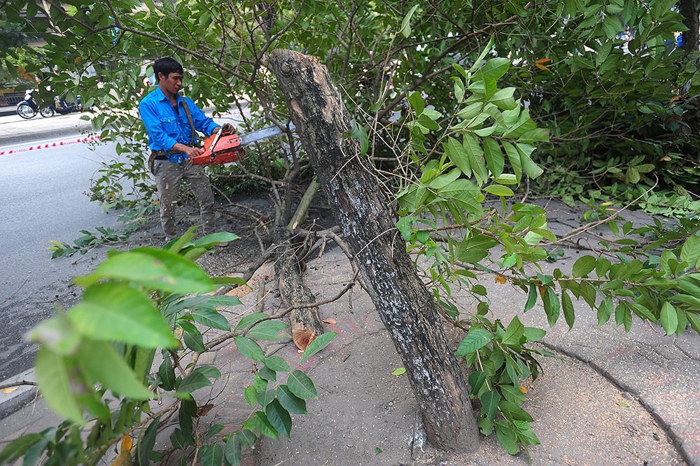Hơn 200 cây cong, mục nằm dọc tuyến đường Kim Mã - Nguyễn Thái Học của Hà Nội đang được chặt hạ để thay thế bằng những cây mới thẳng và đẹp hơn.