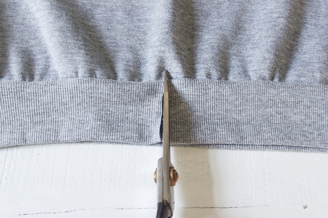 | Bắt đầu bằng cách gấp đôi chiếc áo và dùng kéo cắt mặt trước ra làm đôi theo đường gấp vừa tạo thành. |