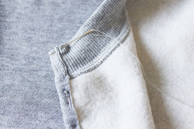 | Gấp phần vải vừa cắt vào phía trong với chiều rộng khoảng từ 3 – 4 cm và dùng kim may thành đường viền nếp áo. Bạn nên cẩn thận ở thao tác này, lưu ý khoảng cách của các mũi kim cho đều và khéo để chiếc áo khoác thêm đẹp, chỉn chu hơn. |