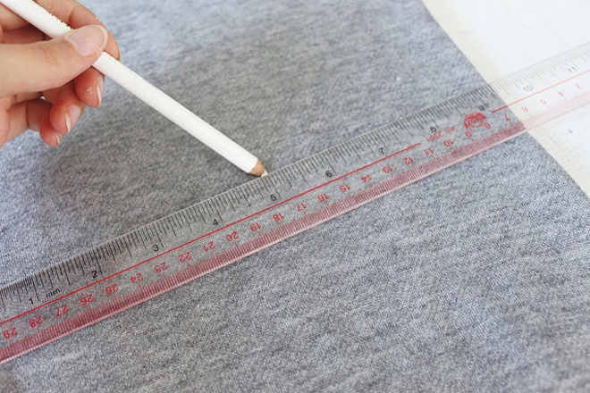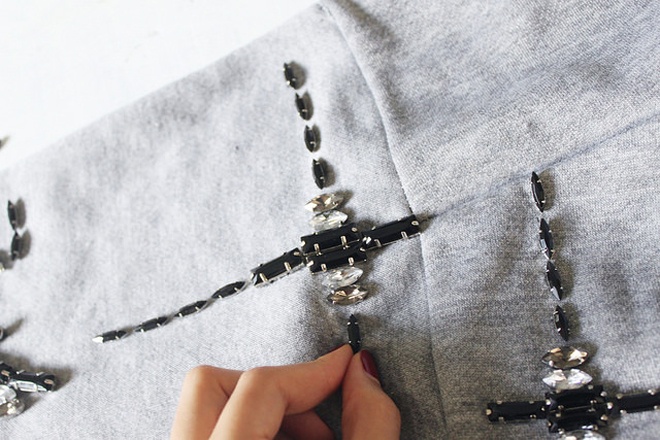 | Dùng thước và bút chì trắng kẻ các đường trang trí trên mặt trước của áo theo sở thích, có thể là các hình thoi, tam giác hoặc hình vuông, sau đó sắp xếp hạt đá lên những đường kẻ để tạo thành các chi tiết trang trí ấn tượng. |