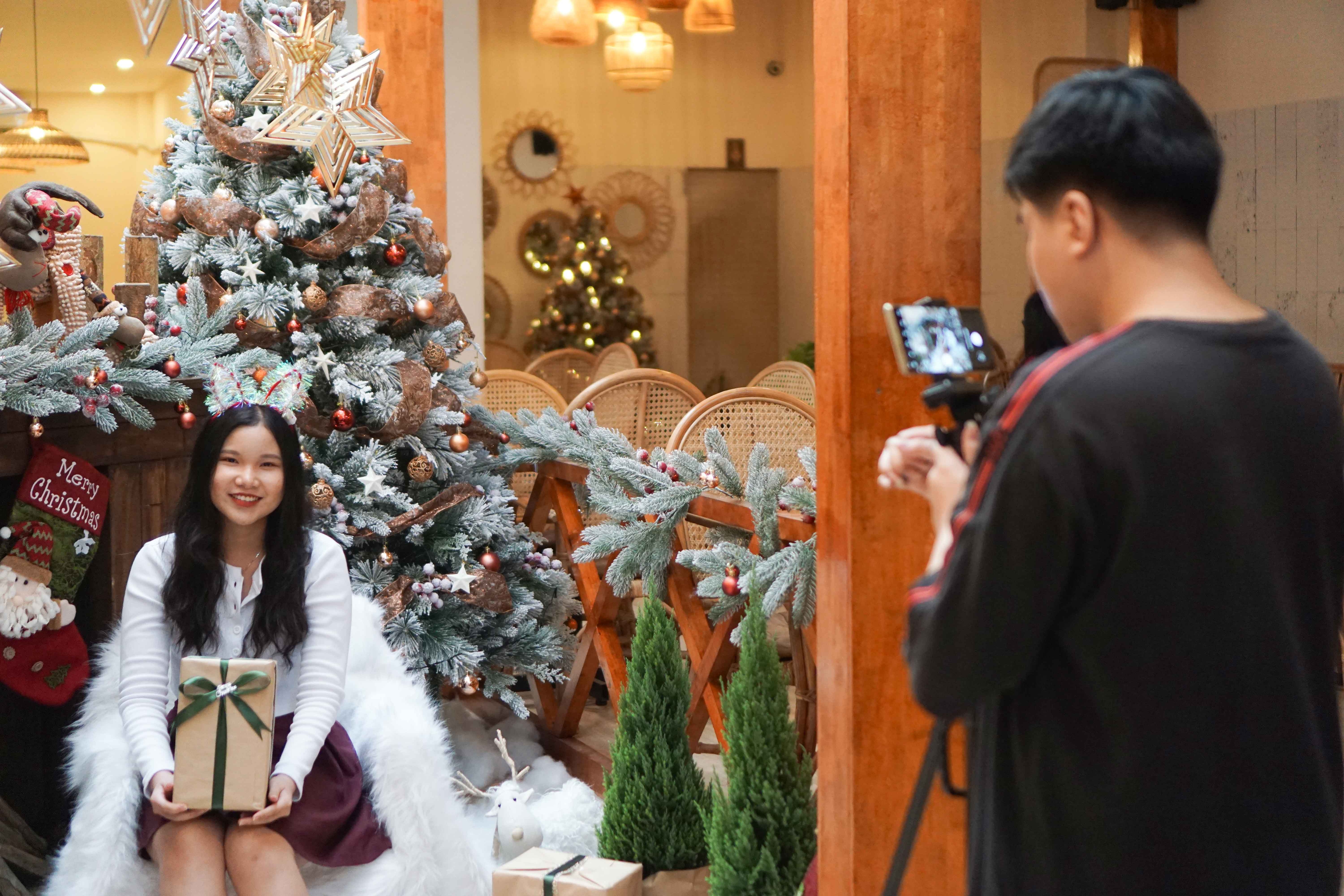 Khoảng một tuần nay, nhiều bạn trẻ chia sẻ hình ảnh check-in mùa Giáng sinh sớm nên tôi tò mò ghé thử. Mặt tiền rộng và trang trí chỉn chu với cây thông Noel, hoa tuyết, nơi này dễ dàng thu hút thực khách qua lại. Bên trong quán rộng nhưng chỉ bố trí một góc chụp ảnh nhỏ ở lối ra vào.