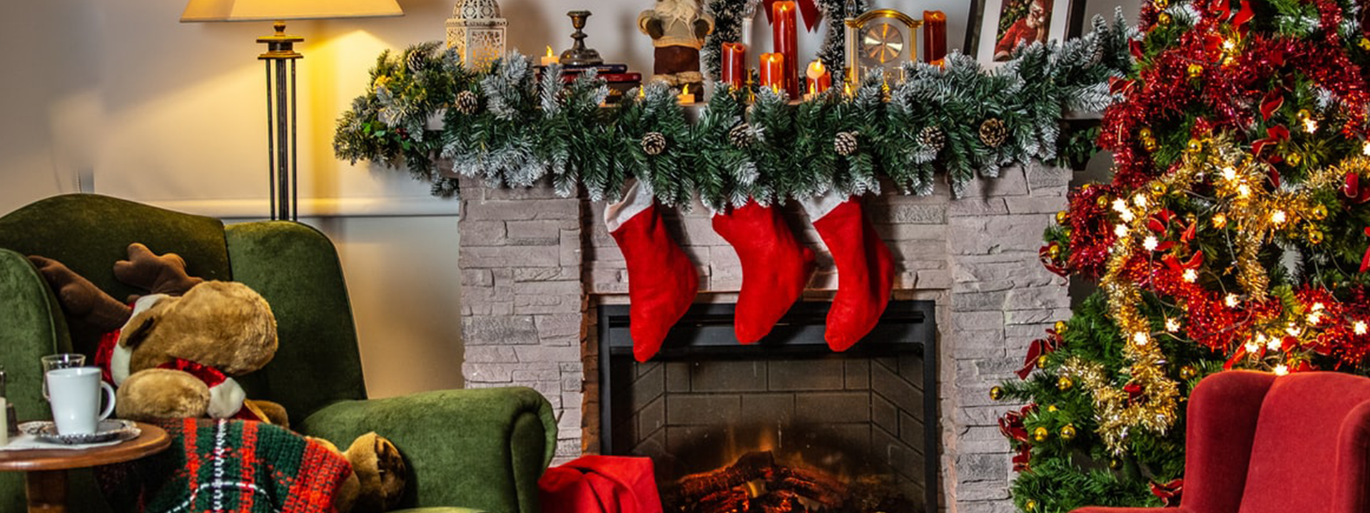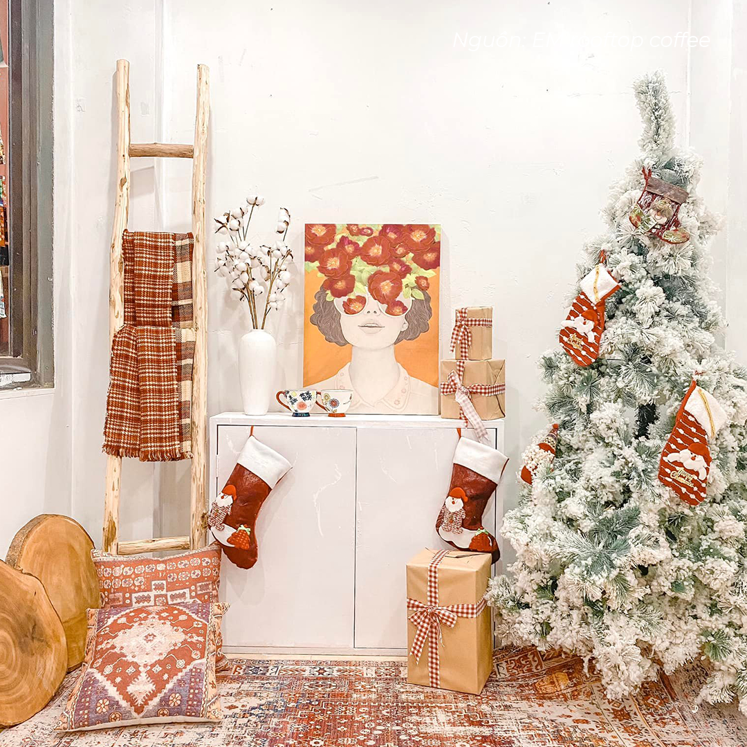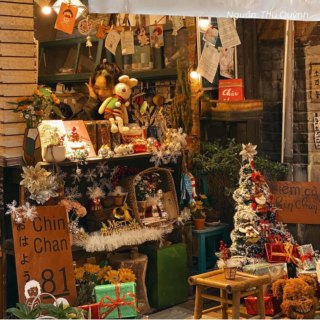 Ngay khi đến quán, không khó để tôi nhận ra mùa lễ hội cuối năm đã rộn ràng tại đây. Trước cửa, ông già Noel, nhân vật quen thuộc của lễ Giáng sinh đứng chào khách. Vào bên trong, quán sắp xếp một góc riêng với cây thông, hộp quà, người tuyết, vòng nguyệt quế... để bạn đứng check-in mà không lo bị vướng khung hình.