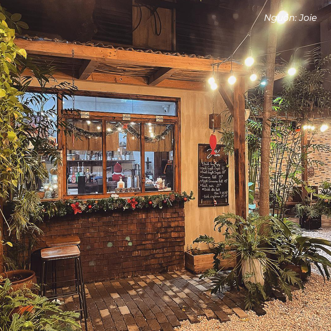 Ghé quán vào đầu tháng 11, tôi đã thấy địa chỉ này rộn ràng không khí Noel với cây thông, vòng nguyệt quế, đèn nháy... Nằm trong khu tập thể cũ, Joie là quán cà phê sân vườn khá yên tĩnh. Quán tinh tế khi kết hợp trong không gian xanh là tone màu gỗ tạo cảm giác ấm cúng.