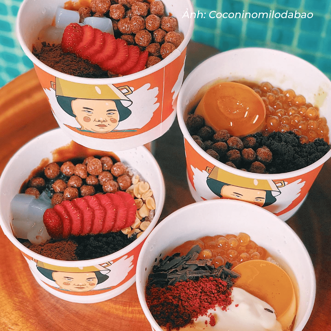 Tôi chọn thưởng thức milo đá bào phô mai sợi. Phần ăn gồm đá bào nhuyễn mịn, trân châu giòn dai, bánh flan mềm thơm, sốt milo dầm, phô mai sợi, snack milo. Ngoài ra, dâu tây được cắt lát mỏng trang trí bề mặt càng đánh thức vị giác. Tổng thể món tráng miệng hài hòa vị chua dịu, ngọt vừa và đắng nhẹ. Món ăn được đựng trong tô giấy.